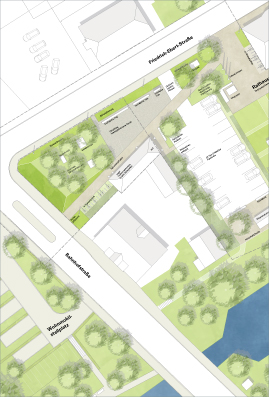 Im südliche Zugang zur Stadtmitte im Kreuzungsbereich Friedrich-Ebert-Straße und Bahnhofstraße entsteht ein neuer Freiraum für alle Bevölkerungsgruppen. Das Planungskonzept verfolgt den Ansatz einer robusten und flexibel nutzbaren Freifläche, die mit der Aktivität der Bewohner bespielt und belebt werden kann. Mobile Sitzgelegenheiten und temporäre Spielelemente bieten Platz für flexible Entwicklungsmöglichkeiten. Der Kreuzungspunkt wird markiert über ein erhöhtes, baumüberstelltes Plateau.