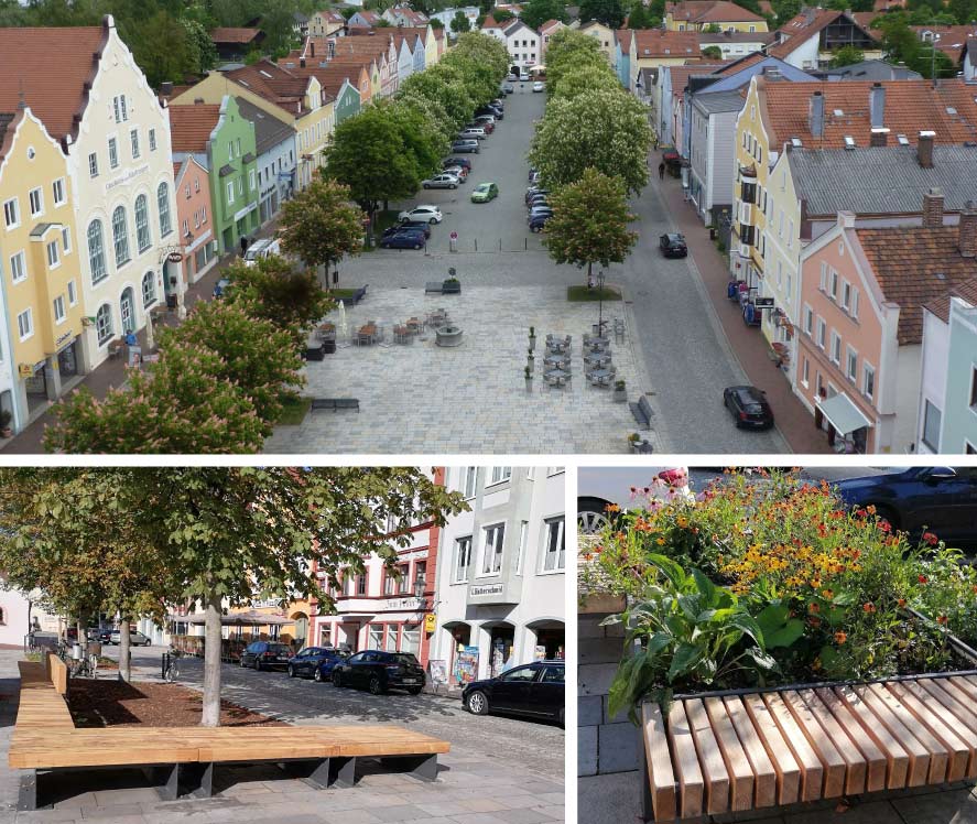 Der Untere Markt ist Teil des historischen Stadtplatzes der Stadt Dorfen. Die vorhandenen Großbäume werden erhalten und vitalisiert, die Baumscheiben werden vergößert. Die Bepflanzung wird durch neue Bäume ergänzt. Neue Aufenthaltsbereiche entstehen durch eine lange Sitzbank mit Holzdeck entlang der neuen Pflanzflächen, sowie durch ergänzende mobile Sitz- und Pflanzelemente. Die Planung geht sensibel mit den Bestand um, erhält vorhandene Beläge und führt die Gestaltung des Platzes sinnvoll weiter.
