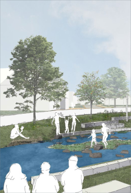 Der verlagerte Bach wird zum neuen Spiel- und Aufenthaltsbereich. Der aufgeweitete, flache Bachabschnitt mit Trittsteinen und einer Mittelinsel schafft mit zusätzlichen Wasserspielelementen wie Wasserspindel und Wasserstehlen ein attraktives Spielangebot.