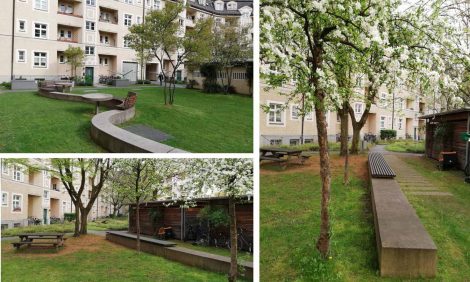 Auch 20 Jahre nach seinem Neubau hat der Wohnhof Ridlerbock in München seinen Charme nicht verloren. Einige Elemente haben Moos angesetzt, manches wurde vom Bauherrn ergänzt. Aber die Fläche wird gepflegt und zeigt Nutzerspuren. Das freut mich mehr als die Verleihung des Nachbarschaftspreises, den wir damals für die Planung erhalten hatten.
